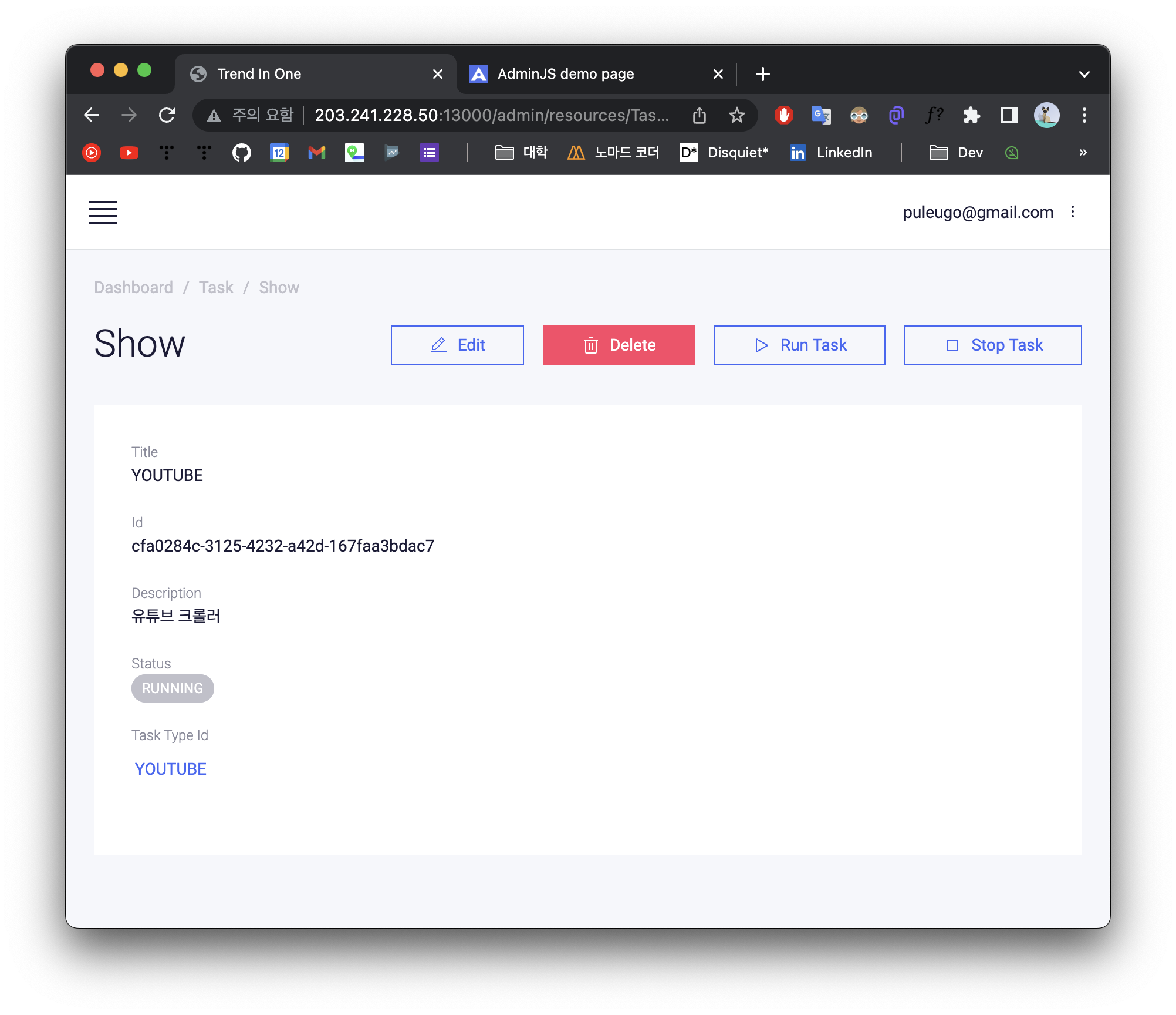 위 관리 페이지에서 Run Task / Stop Task는 제가 만들어둔 함수에 매핑해둔거에요.