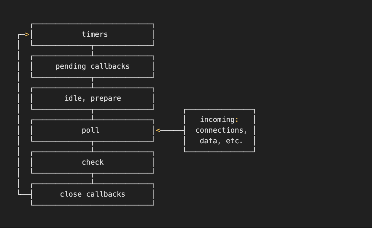 close callbacks(콜백 완료하기): 소켓이나 핸들이 갑자기 닫힌 경우(예: soket.destory()), 이 단계에서 ‘close’ 이벤트를 발생시킵니다.