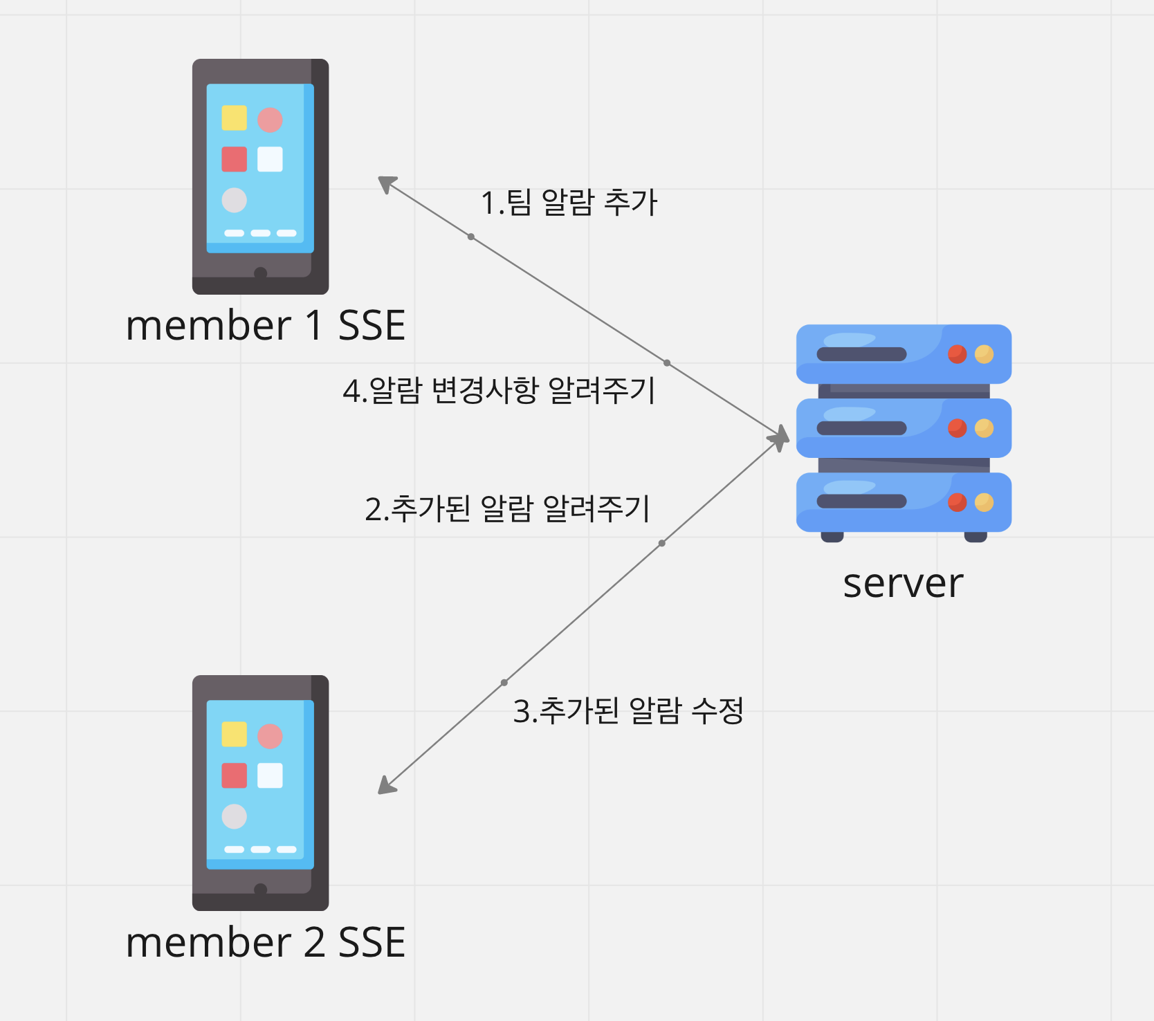 - 본인이 속한 팀들에서 알람의 변경사항(추가, 삭제도 포함)이 발생 시, SSE를 통해 알려준다.