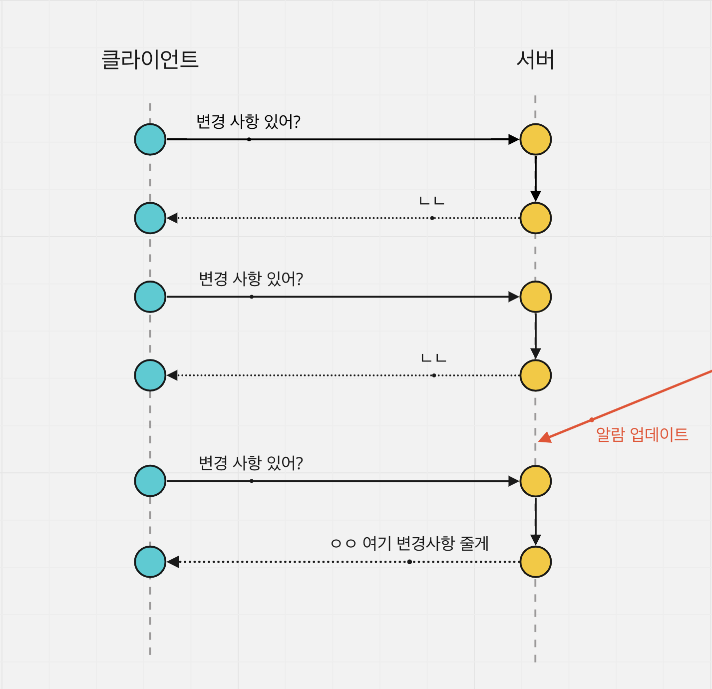 폴링은 단순하게 API를 주기적으로 여러번 날려서 변경되었는지 확인하는 방식이다.