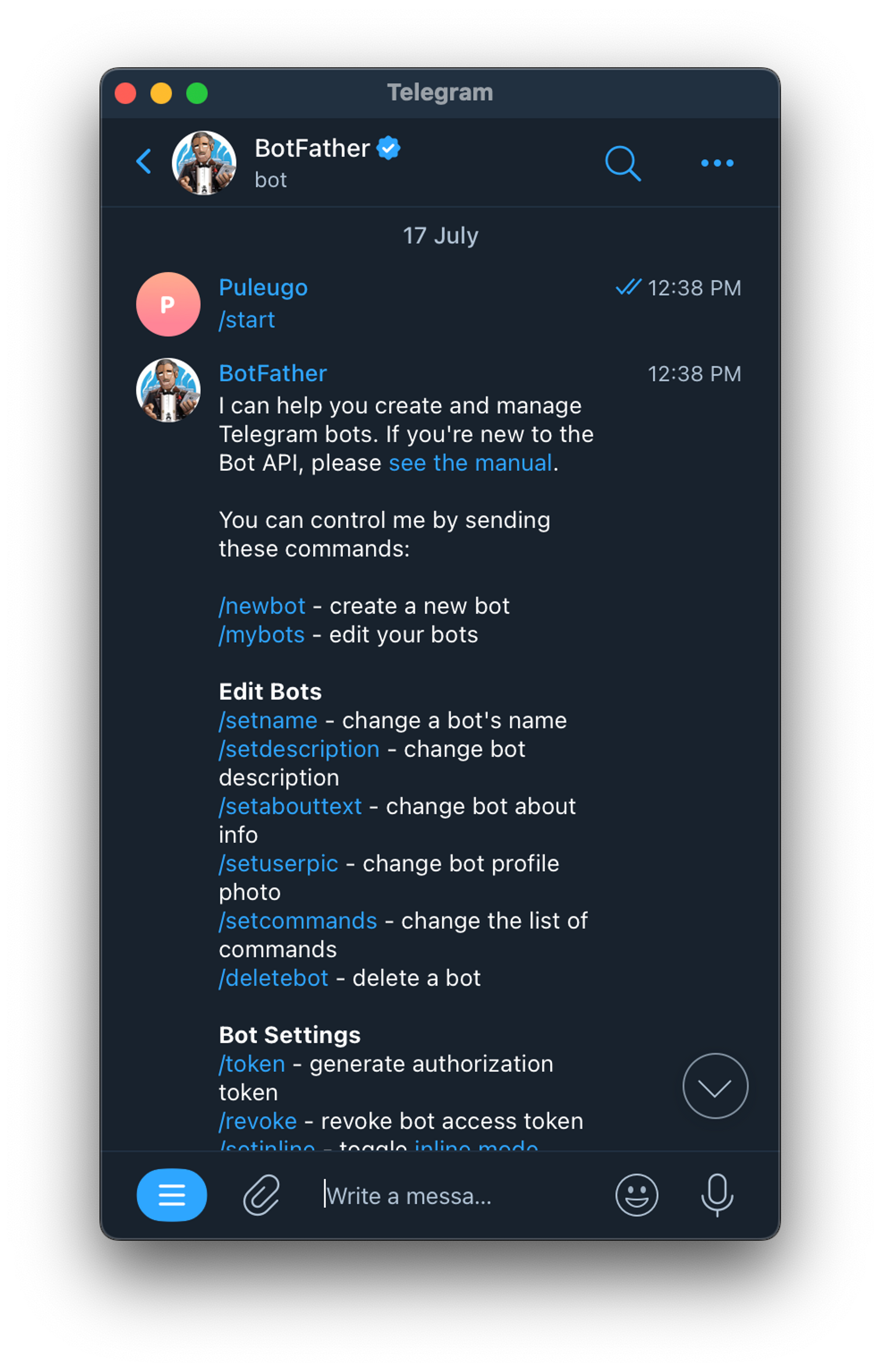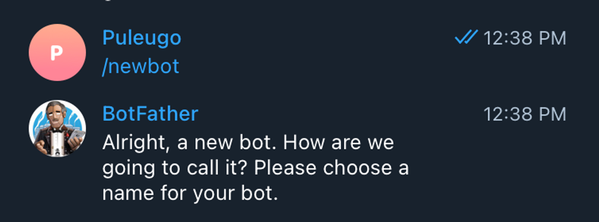 3. /newbot 명령어를 입력하여 새로운 봇을 만들어주세요.