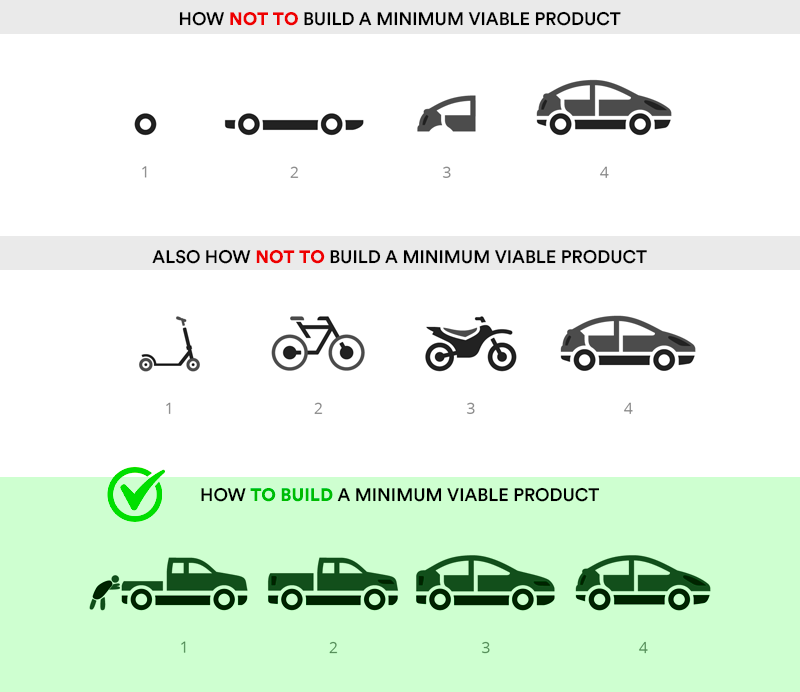 자동차라는 MVP를 만들 때는 자전거부터 시작하는 게 아니라, 최소한 자동차가 구현되어야 한다.