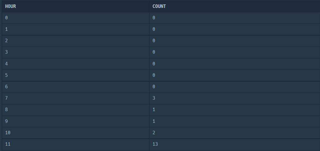 WHERE HOUR(DATETIME) = @hour) as COUNT