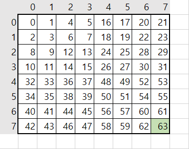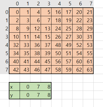 맵은 23(8*8)의 사이즈를 가지고 (7, 7)의 좌표에 있는 값이 몇인지 구하는 문제입니다.