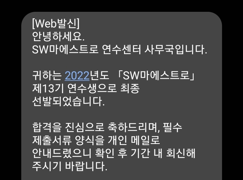| [SW 마에스트로] 13기 서류 합격 후기 + 작성법 공유 (6) | 2022.02.13 |